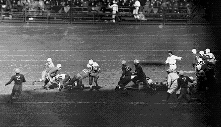 Colgate (in the partially white jerseys) against NYU at Yankee Stadium in front of 35,000 fans. Colgate halfback Whitey Ask threw a 53 yard touchdown pass on the opening drive, then an interception set up an Ask touchdown run early in the 2nd quarter, and Colgate won 14-0. NYU was held to 3 first downs and 70 yards.
